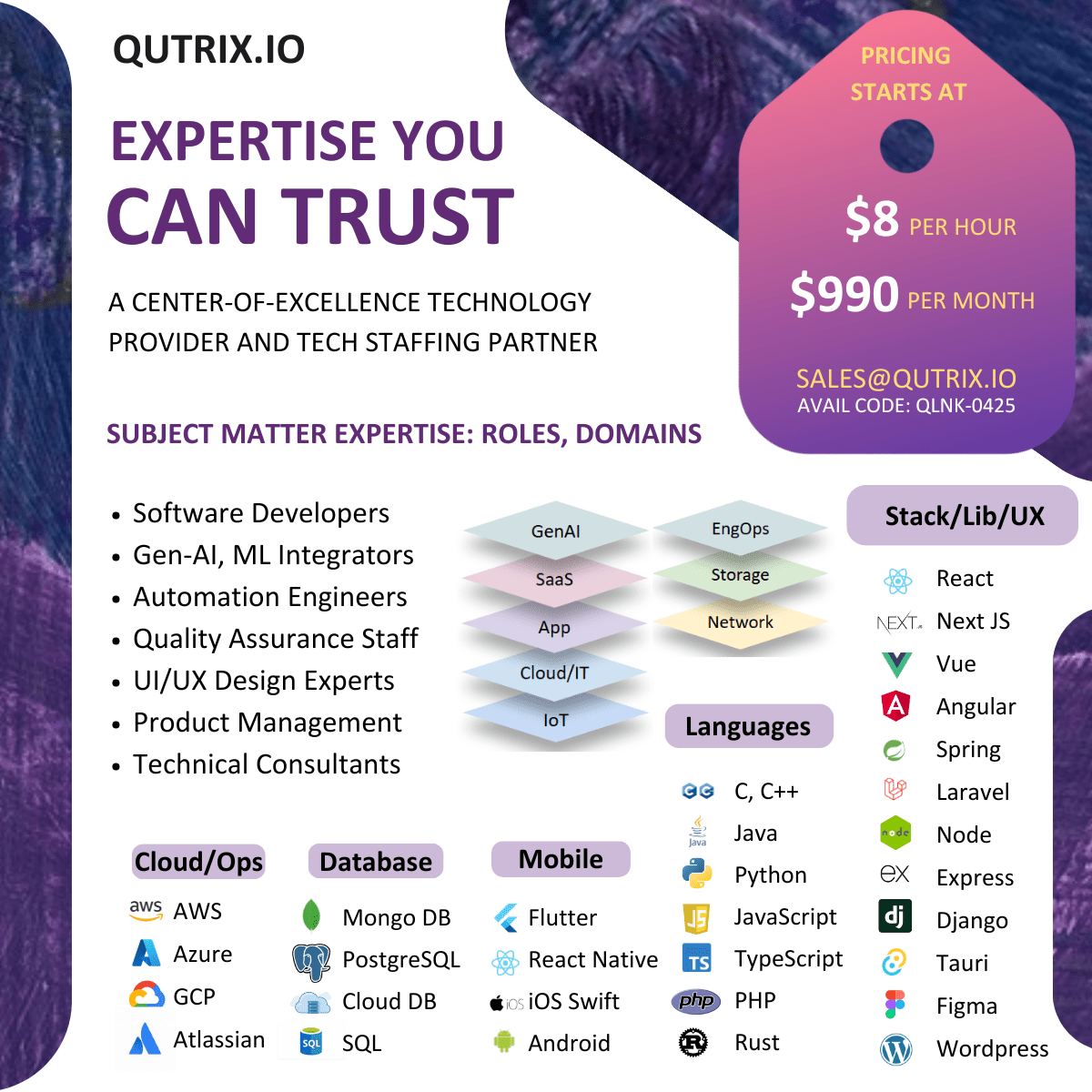 If you are interested to explore how we can help optimize your OPEX, feel free to write to us at sales@qutrix.io. Use mail code QLNK-0425 to avail the optimized pricing and get a quick proposal at Zero-cost.